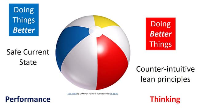 A well-known facilitation technique is the beach ball analogy. It is used as a way to acknowledge that people may have a different view of the same thing and it doesn’t always mean that they are wrong, necesserily. It goes like this; imagine two people are looking at the same beachball. It has three white segments and three coloured segments; but each person can only see three segments on their side. So if you look from the left hand side you think the beach ball is only white and blue; and if you look from the right hand side it looks white, yellow and red. They’re both right but, they’re both different. They are both looking at exactly the same item or situation but seeing things completely differently. In our case the blue side is the side of the safe paradigm and efficiency and the opposite side is a new lean paradigm and effectiveness. One trouble with a counter-intuitive truth is explained by Robert “Doc” Hall in his 2001 AME article “The Counterintuitive Principles of the Toyota Production System” when he says “The (TPS) principles reinforce each other in non-linear fashion, so they are best learned experientially. A Toyota sensei seldom talks about them until after people have experienced TPS techniques and “peopleware” practices.The underlying philosophies clarify by first learning to”live the system,” then thinking deeply about it.” This normative experience is critical to being able to understand.